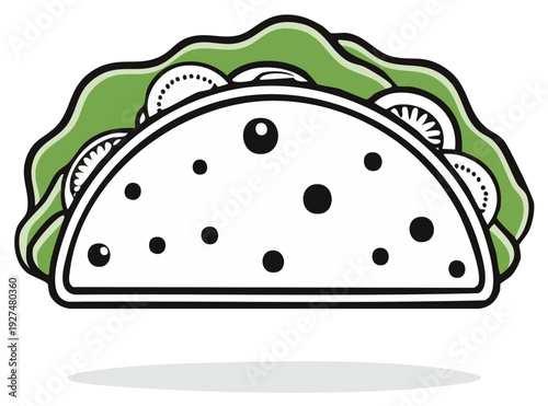 Minimalist taco icon with green lettuce and tomato slices in a simple line art style