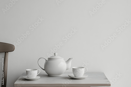 teapot, teacup, table, chair, white, ceramic, minimalist, simple, clean, bright, interior, design, home, kitchen, still life, morning, breakfast, beverage, drink, tea