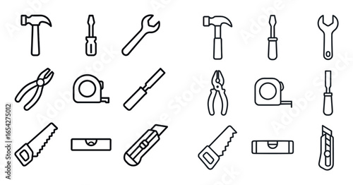 tool, hand tool, hammer, screwdriver, wrench, plier, tape measure, chisel, saw, level, vector, flat, outline, isolated, minimal, icon, simple, graphic, linear, black