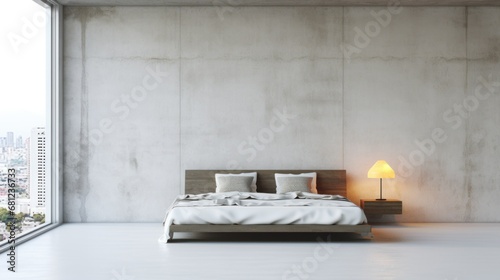 minimalist, urban, bedchamber, platform, bed, monochromatic, concrete, wall, industrial, loft, large, window, functional, furnishing, sleek, modern, simplicity, roomy, contemporary, chic, minimal, stylish, metropolitan, elegance, serene, uncluttered, architectural, luxury, comfort, urban living, tranquil, aesthetic, open space, modernist, sophisticated, refined, design, trendy, lifestyle, ambient, panoramic
