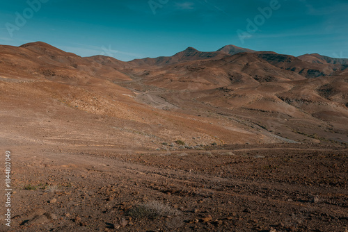 Minimalist volcanic landscape on Fuerteventura island with barren hills and rocky terrain, remote walking paths, solitude, nature travel and untouched wilderness