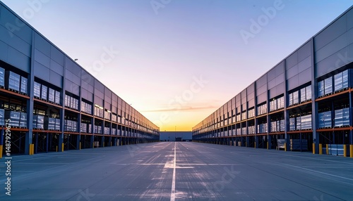warehouse, distribution, center, minimalist, shelving, unit, dawn, sunlight, empty, architecture, storage, industry, facility, perspective, line, sky, colours, exterior, design, layout, symmetry, space, morning, vehicle, loading, dock, construction, urban, logistic, aisle, calmness, daylight, shadow, structure, absence, freight, arrangement, horizon, building, calm, open, coverage, shelf, blue, orange, setting, concrete, landscape, equipment