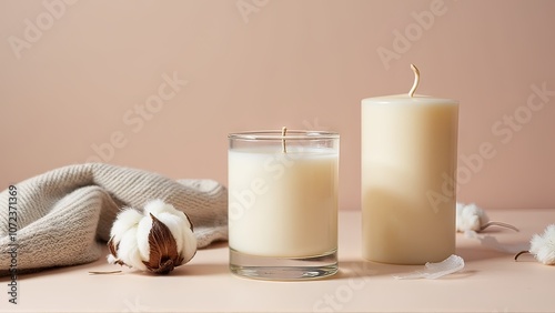 Minimalist white candles on beige background with cotton and knit fabric, evoking warm, serene relaxation