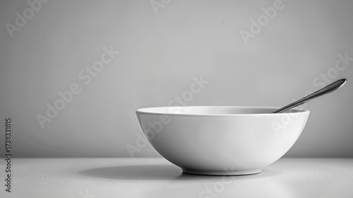 Minimalist white ceramic bowl with spoon on a clean surface.