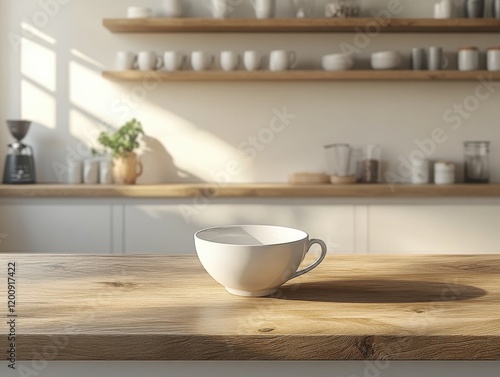 Minimalist White Cup on Wooden Table in Bright Kitchen Environment