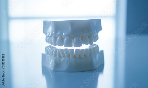 Minimalist white dental model illuminated by soft blue light, emphasizing clean and professional design for a modern medical composition