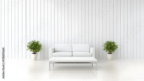 Minimalist White Interior Living Room with Cozy Sofa and Potted Plants in Modern Design