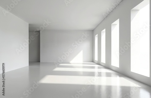 Minimalist white interior room with clean walls, floor, ceiling. Sunlight streams through tall windows casting geometric shadows. Ideal for presentations, exhibitions, modern architectural concepts.