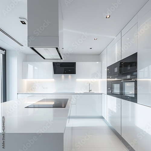 Minimalist white kitchen interior featuring a seamless countertop, high gloss white cabinets, and a minimalist vent hood