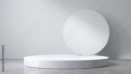 Minimalist white product display podium with circular backdrop.