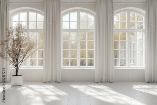 Minimalist white room with arched windows bathed in sunlight, offering a serene autumn view and an inviting ambiance