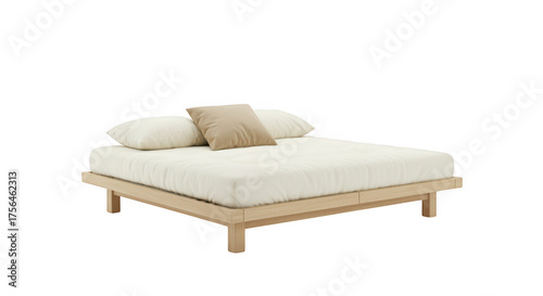 bed, bedchamber, furniture, mattress, pillow, cushion, wooden, wood, platform, frame, low, modern, minimalist, contemporary, simple, clean, design, interior, decor, home, sleep, rest, comfort, cosy, soft, neutral, beige, tan, light, natural, object, isolated, cut-out, studio shot, no people, empty, domestic, relaxation