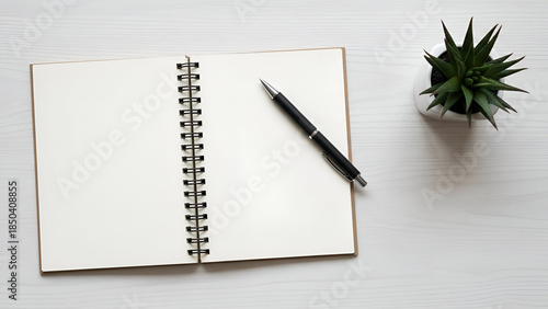 Minimalist Workspace: Open Notebook, Pen, and Succulent Plant on a Bright White Surface