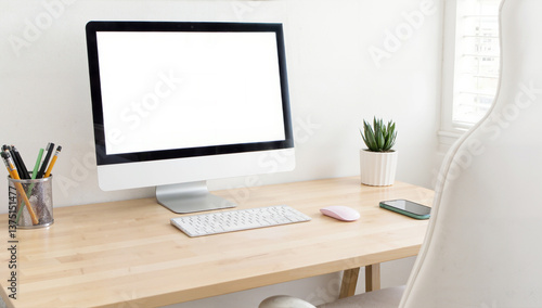 Minimalist workspace with a desktop monitor, soft lighting, wooden desk, potted plant, ideal for productivity and creativity. Isolated on white background or PNG