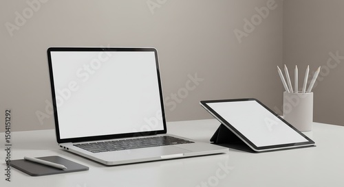 laptop, tablet, stylus, minimalism, workspace, desk, technology, screen, white, grey, modern, office, digital, design, clean, sleek, contemporary, contraption, device, surface, flat, electronic, communication, stationery, pen, accessory, presentation, display, blank, empty, background, corporate, business, freelance, creative, professional, education, learning, productivity, innovation, collaboration, connected, wireless, portable, computing, planning, organisation, style