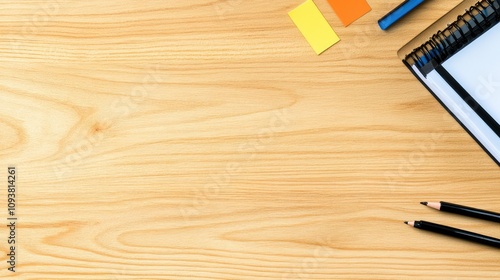 Minimalist Workspace with Stationery Items on a Wooden Desk Featuring Notepad, Sticky Notes, and Writing Utensils for Creative Productivity and Organization