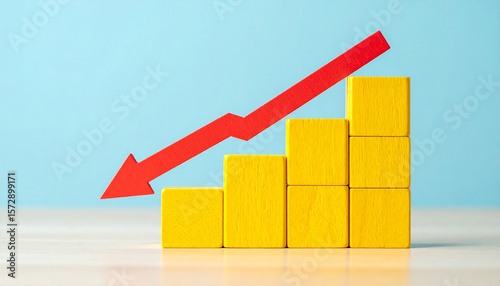 Minimalist yellow graph with red arrow pointing down. Business risk, financial decline, money loss