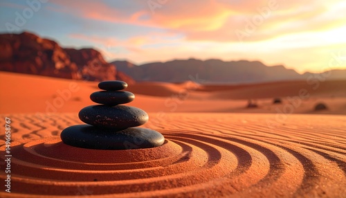 Minimalist zen garden on Mars, red sand with black stones arranged in perfect balance, futuristic sky and alien terrain, 8K resolution