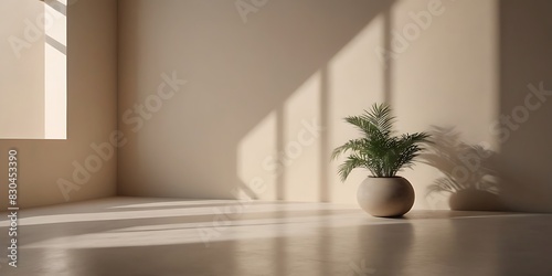 Minimalistic Abstract Light Beige Background Perfect for Product Presentation, Enhanced by Gentle Light and Intricate Shadows Cast by a Window and Ve vegetation on the Wall, Adding a Touch of Elegance