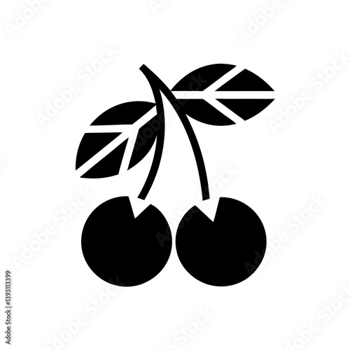 Minimalistic Cherry Fruit Icon with Leaves in Solid Black Silhouette Style