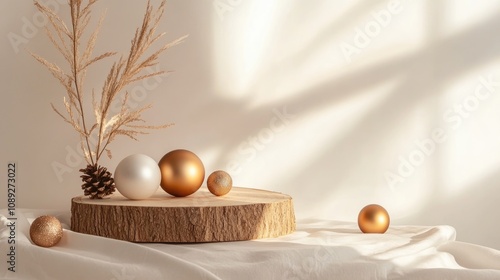 Minimalistic display with a wooden podium, decorated with festive golden and white balls, soft shadows, and natural accents in a light backdrop.