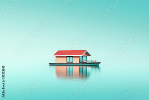 minimalistic houseboat on calm water, reflecting serene atmosphere