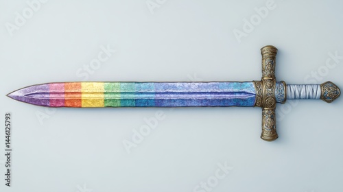 Minimalistic illustration of a medieval sword with a rainbow-colored blade and ornate gold and blue hilt