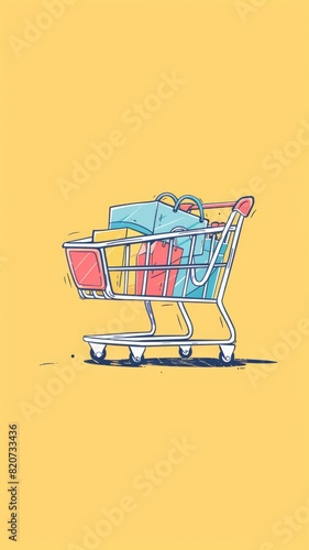 Minimalistic shopping cart illustration, cute discount banner, coupon code animated sequence, comical style