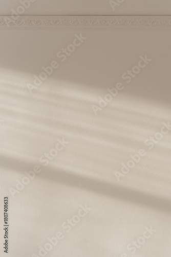 Minimalistic wall with soft shadows and light beams, peaceful ambiance, copy space. The sun shining through the wall.