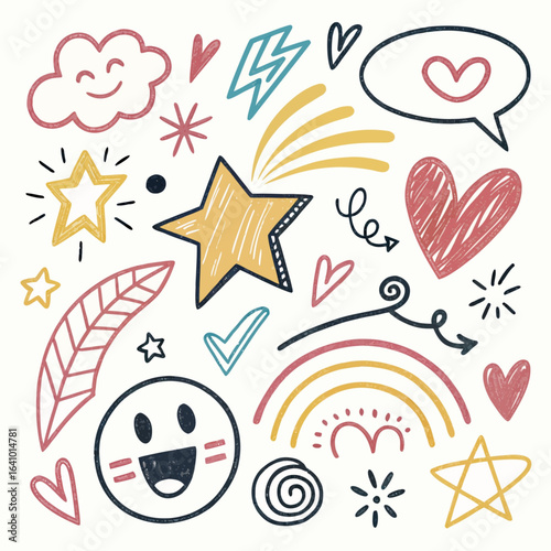 doodle, hand-drawn, star, heart, cloud, rainbow, whimsical, shape, icon, arrow, swirl, leaf, lightning, speech bubble, smiley face, sparkle, scribble, vignetting, drawing, illustration, clip art, design element, decoration, cute, fun, playful, bright, colourful, graphic, art, vector, isolated, pattern, background, texture, abstract, symbol, signs, element, artwork, creative, artistic, decorative, motif, style, trendy, modern, simple