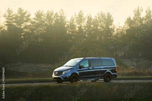 Minivan commuting on suburban roadway