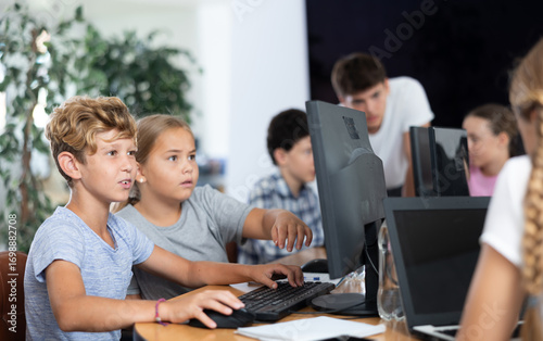 Minor female and male students sitting at computer together with other attendees of IT courses