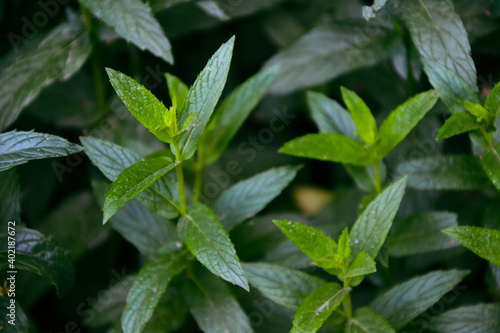 Mint plant in the garden. Spearmint foliage. Organic agriculture. Mint in the wild nature. Herb tea flavor. Village yard herbs.