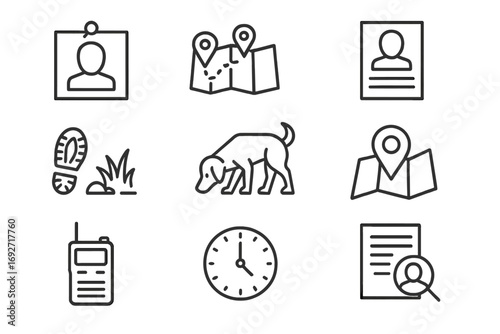 missing, person, icon, line, style, investigation, photo, pinned, map, route, icon, whistle, call, alert, flier, shoe, field, pet, sniffing, ground, last, known, location, mark, phone, symbol
