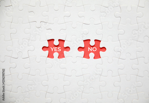 Missing puzzle pieces with check mark and cross symbols. Approve or reject, right or wrong, yes or no in decision making, education or voting concept.
