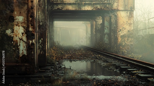railway, abandoned, rust-eaten, infrastructure, fog, mist, track, puddle, metal, nature, overgrown, bridge, tunnel, dark, gloomy, industrial, weathered, decay, old, structure, architecture, transportation, travel, landscape, outdoors, atmospheric, environment, rail, train, urban, exploration, deserted, vintage, grunge, pathway, perspective, nobody, plant, stone, leaf, moss