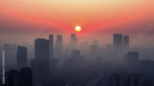 Misty city skyline at sunset with vibrant colors and silhouette