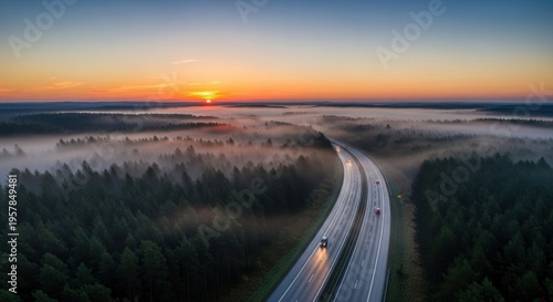 highway, sunrise, fog, forest, road, landscape, travel, dawn, nature, mist, traffic, journey, car, transportation, aerial, atmospheric, scenic, sky, twilight, driving, timberland