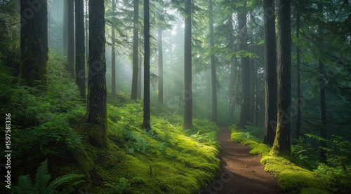 forest, path, misty, tree, sunlight, moss, fern, green, nature, wood, landscape, calm, serene, tranquil, fog, damp, hiking, adventure, scenic, oregon, pacific, northwest, evergreen, lush, vibrant, bright, gentle, light, shadow, detailed, growth, pathway, beauty, walk, flora, fauna, wild, soft, depth