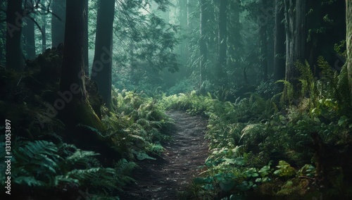 Misty Forest Path Green Foliage and Tall Trees in Soft Light