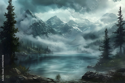 mountain, lake, forest, mist, cloud, nature, landscape, scene, serene, peaceful, calm, quiet, view, water, sky, tree, pine, foggy, rocky, shore, dramatic, light, colours, dark, grey, blue, green, brown, texture, detail, illustration, digital, painting, art, impression, beautiful, artistic, mountainous, vale, still, atmosphere, tranquil, impassioned, vision, visionary, evening, morning, misty