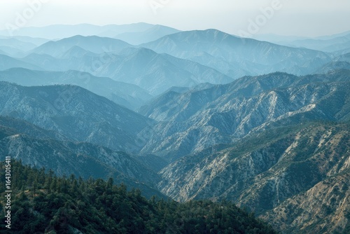 Misty mountain range, layered peaks, hazy blue tones, forested valleys
