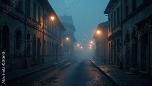 Misty Night Street Scene An Enigmatic Alleyway Bathed in the Soft Glow of Streetlights