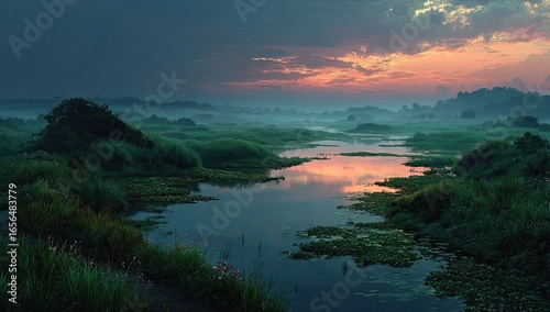 sunrise, river, misty, landscape, nature, morning, foggy, calm, scenic, water, green, cloud, tranquil, beautiful, dawn, river bank, grass, duck pond, plant, waterfall, view, panorama, travel, trip, serenity, photo, image, cloudscape, fog, explore, relaxation, dreamy