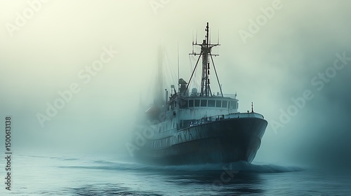 ship, sea, fog, misty, ocean, vessel, marin, boat, water, wave, navigation, voyage, journey, travel, sailing, cruise, cold, weather, atmosphere, calm, adventure, transport, transporting, passenger, cargo, exploration, coast, horizon, twilight, daylight, sunrise, sunset, photo, image, landscape, nature, art, photo, artistic, dramatic, silhouette, powerful, motion, speed