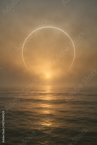 solar eclipse, eclipse, sun, moon, astronomy, science, ocean, sea, water, horizon, sunrise, sunset, mist, fog, light, aethereal, serene, magical, celestial, cosmic, phenomena, nature