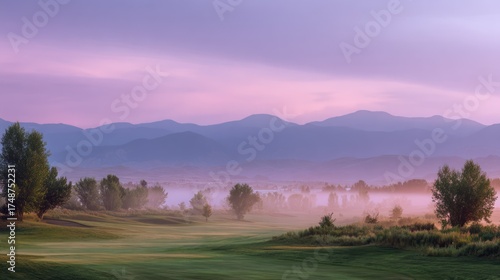 sunrise, mist, mountain, golf, course, landscape, vale, tranquil, serene, morning, pastel, colours, peaceful, nature, foggy, green, tree, grass, calm, light, meadow, outdoors, beauty, quiet, view, horizon, elevation, soft, blur, scenic, vibrant, dreamy, summer, photo, early, gentle, atmosphere, picturesque, amazing, gold, rose colored, purple
