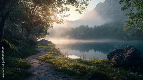 Misty sunrise over calm lake, path by lush greenery, mountains in background.