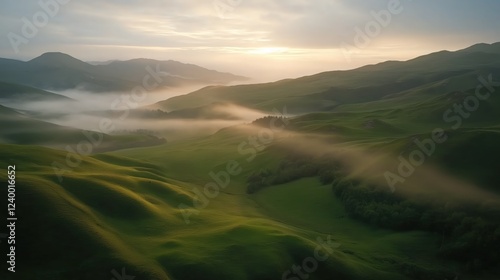 Misty Sunrise Over Rolling Green Hills And Valleys