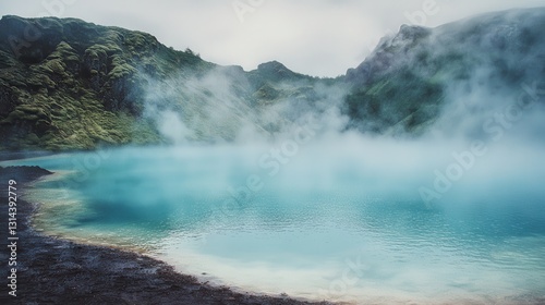 Misty Thermal Lake Surrounded by Lush Mountains and Soft Fog